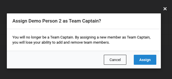 A team captain can also assign a new team captain. By doing so, the original captain will lose their ability to perform captain actions. The new team captain does not need to consent to this change and will have the ability to perform all captain actions thereafter.