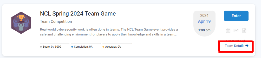 After team setup has been completed, you will have access to the event from the competition dashboard. Click the Team Details button to go directly there, or navigate to the Team tab on the event page.