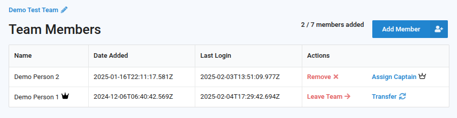 Team Captains have additional permissions than regular players. They have the ability to add members to the team by sending the Invite URL to the player for them to complete their team setup steps. To invite a new team member, simply click on the "Add Member" button and share the Invite URL from the modal with the intended recipient.&#x20;